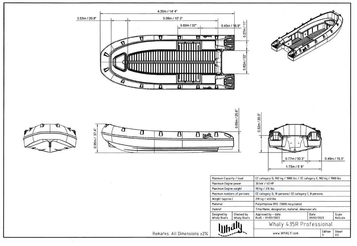 Whaly 435 je izuzetno čvrst čamac s dvostrukim zidovima, proizveden od visokokvalitetne plastike (polietilena) – gotovo neuništiv i nepotopiv. Ovaj čamac zahtijeva minimalno održavanje i izrađen je od 100% postojane plastike u boji. Ove karakteristike će vas zasigurno uvjeriti u njegovu kvalitetu.